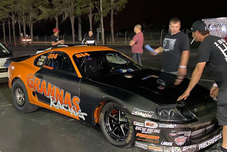 As you can see in the video above, the Grannas Racing “Orange Man Bad” Toyota Supra rocketed to a 6.90 second pass @ 194 mph in the quarter mile on a h-pattern faceplated T56 “GR1000F” transmission kit. It has seen 208mph in the quarter, but when watching the video, you will see the car glitches and shuts off electrically at about 1000-1100 feet into the run hence the lower MPH (194).
