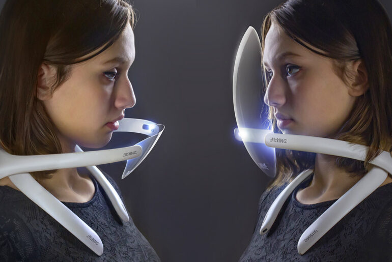 There’s face masks, and then Air-Ring, a wearable air purifier that is design to encompass the user’s face with a refreshing atmosphere of purified air. It uses a powerful silent air turbine to deliver essential airflow, while multi-layered air purification begins with filtration of harmful particles and viruses by a state-of-the-art replaceable N95 HEPA filter at the air intake cartridge.