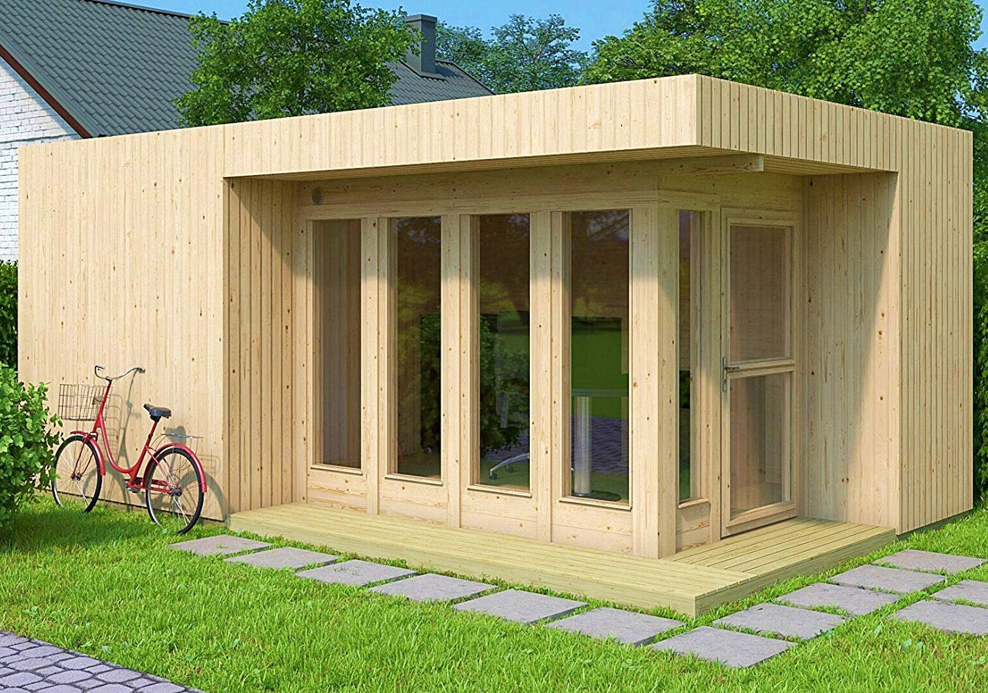 Featuring a contemporary urban styling, complete with large windows that allow natural light to flood in, it’s best suited for environments where the classic cabin style does not fit. Other things you can do once assembled is add your own solar panels, an air conditioner, and even a compost toilet should there be a need. The front height measures 8′ 6″ and the roof pitch 2-degrees.