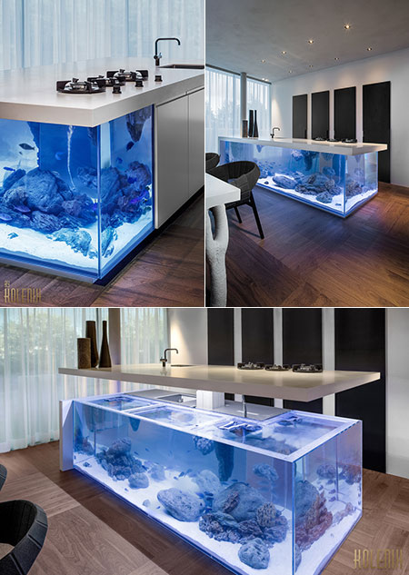 Dutch designer Robert Kolenik specializes in high-end sustainable design, and “Ocean Kitchen” is his latest masterpiece. Shaped like a large “L” – the storage compartment inside the counter is hidden with mirrors to make the aquarium seem larger than it is – the counter-top raises up at the push of a button, allowing you to easily access the aquarium for cleaning and / or feeding the aquatic life. Continue reading for a video and more information.<