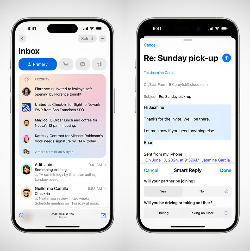 Using the system-wide Writing Tools built into iOS 18, iPadOS 18, as well as macOS Sequoia, users will soon be able to rewrite, proofread, and summarize text nearly everywhere they write, including Mail, Notes, Pages, etc. A new Priority Messages section at the top of the Mail inbox shows the most urgent emails, like a boarding pass. In Notes / Phone apps, users can record, transcribe, and summarize audio. Siri has also been upgraded with richer language-understanding capabilities, making the personal assistant more natural, more contextually relevant, and more personal, with the ability to accelerate everyday tasks. Available this Fall in beta for iOS 18, iPadOS 18, and macOS Sequoia.