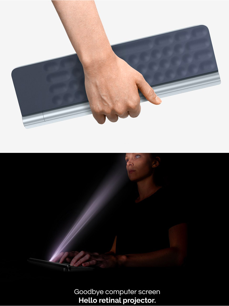 Forget touchscreens, the Aura is a keyboard-shaped, all-in-one computer that projects images directly onto your retina. In other words, it uses eye-tracking Infrared Illuminators that track your gaze as well as reflection patterns to ensure a crystal clear projection onto your retina. The keyboard itself features a sleek, ergonomic concave design with Glow Thru keys with haptic feedback that illuminate in low-light conditions.