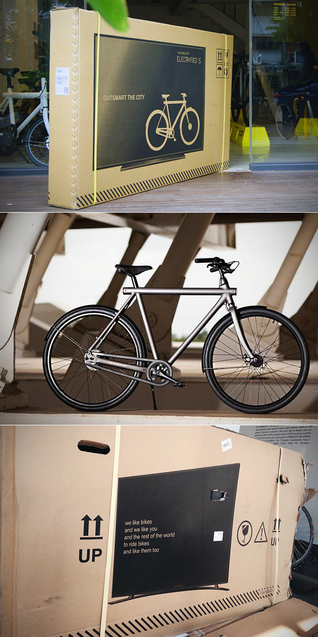 VanMoof knows the horrors of shipping large fragile items, so they decided to the best way to prevent their new electric bicycles from damage was to print a flatscreen TV image in the box.