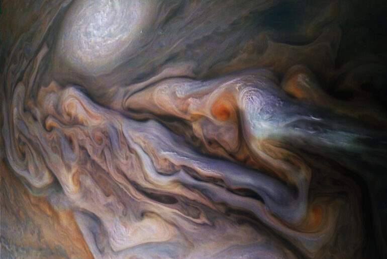 NASA’s Juno spacecraft has captured an amazing photo of Jupiter’s dynamic surface, or to be more specific, a multitude of swirling clouds in the planet’s dynamic North North Temperate Belt with several bright-white “pop-up” clouds as well as an anticyclonic storm, known as a white oval. Two citizen scientists composited the photograph using data from the spacecraft’s JunoCam imager, and an anticyclonic storm, known as a white oval, can also be seen in the image.