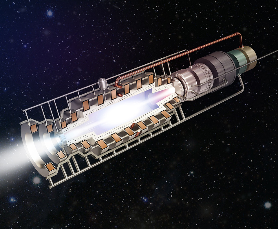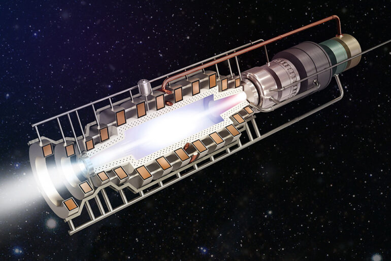 The DFD’s interior will be filled with a magnetically contained hot plasma of helium-3 and deuterium, a unique ‘heavy’ hydrogen with one neutron in its nucleus. The fusing plasma heats the cool propellant that flows outside the confinement area. This propellant is directed out of a nozzle at the back of the engine, creating thrust. All that heat translates into a lot of electricity, which Thomas estimates to be between 1 and 10 megawatts. The DFD will harness that power, using a ‘Brayton cycle’ engine to turn much of the heat into energy.