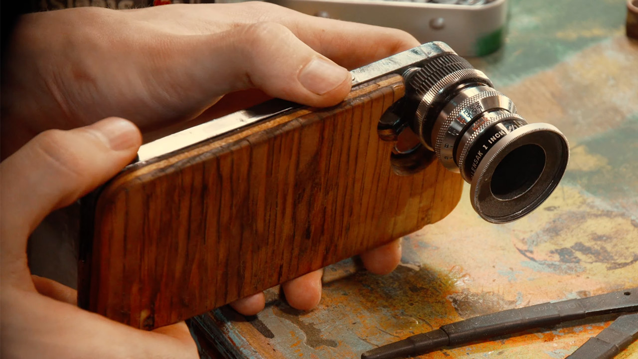 The plywood back of this thing was more than just a functional part; it was a statement. Monsma sanded it down, stained it to a high gloss and then just attached a tripod mount under the lens for stability. The wood also filled in the camera hump the iPhone has so the whole thing was flat and tidy. Then he just slathered on some superglue, a choice that’s raised some eyebrows given how heavy some of those cinema lenses can be.
