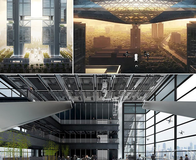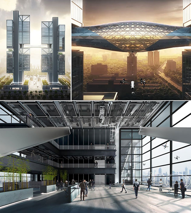The ground floor of the building contains a public exhibition area, a theater for product announcements, cutting edge gymnasiums for staff, and even robot fighting rings. Between the two towers, you’ll find a stunning glass sky bridge, which will have an opening in the bottom for drones to be launched through. On the top floor, sky gardens also contain areas from which drones can be launched.