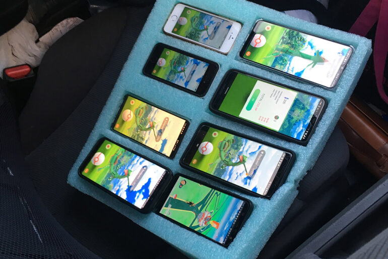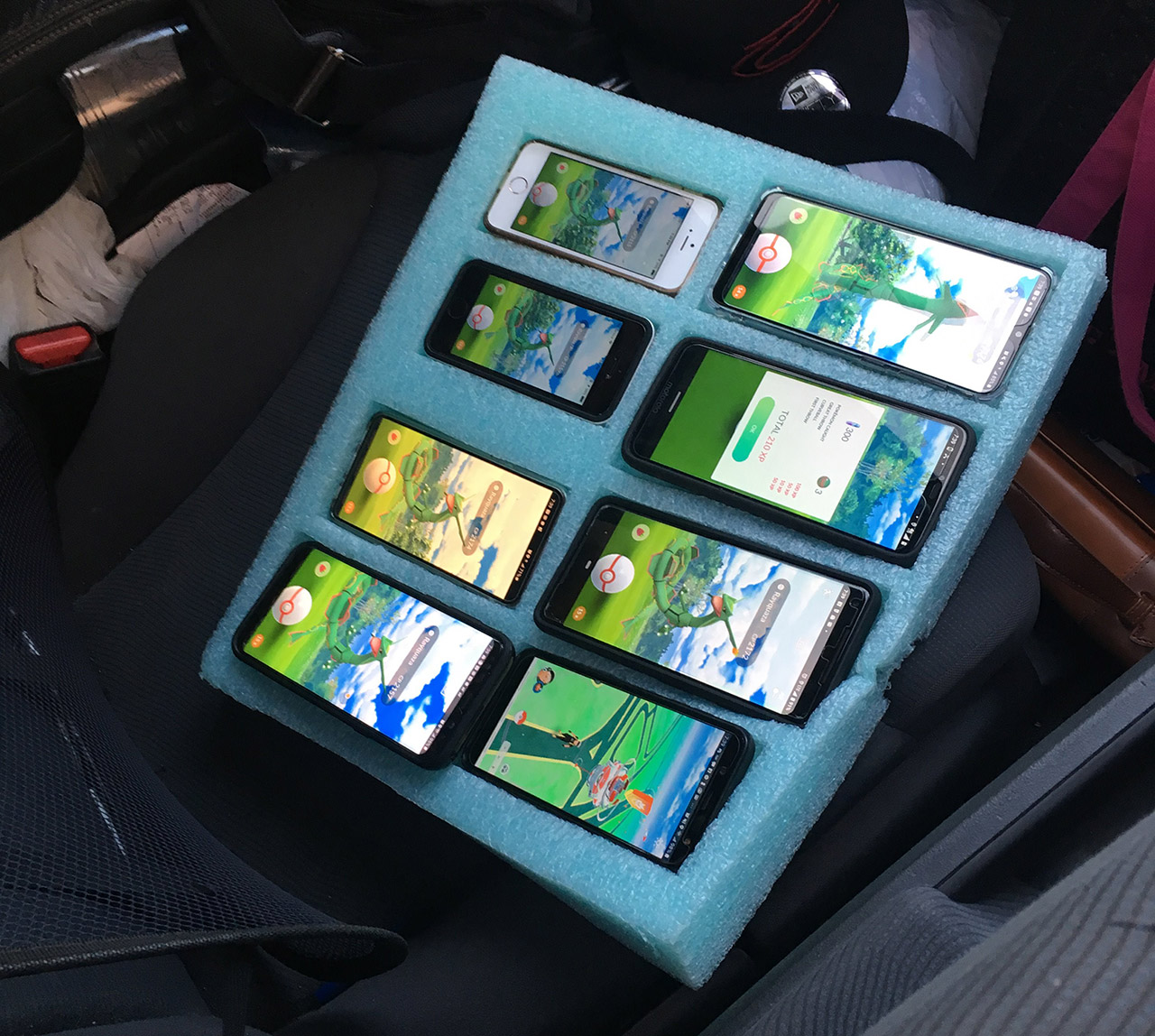 These weren’t just random smartphones laying all over the place, but rather strategically placed in a specially cut blue foam board to hold them securely while trying to catch Pokemon. Fortunately, the driver agreed to put the phones in the back seat and got off with just a warning.