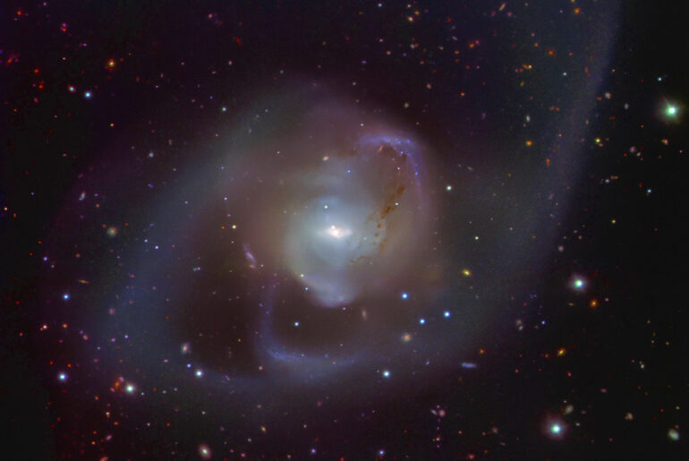 European Southern Observatory astronomers used the Very Large Telescope (VLT) to capture a dazzling cosmic collision, galaxy NGC 7727. This massive entity was created from the merger of two galaxies, an event that started around a billion years ago. If you look closer at its center, you’ll see the closest pair of supermassive black holes ever found.