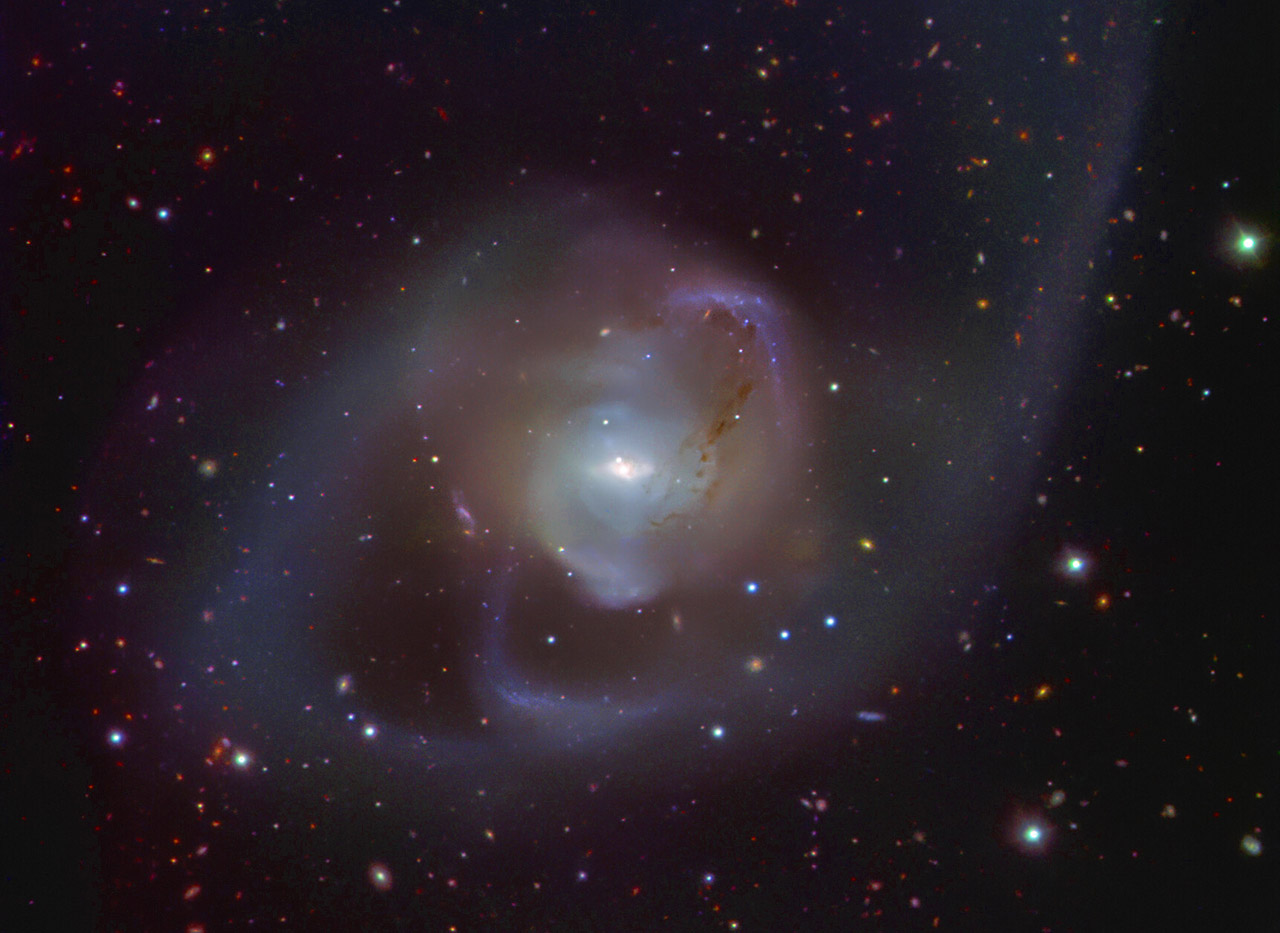 In the zoomed in image above, we get a closer look at the tangled trails created as the two galaxies merged, which stripped stars and dust from each other to create the spectacular long arms of NGC 7727. The two bright points at the center of the galaxy depict the original two galactic cores, each hosting a supermassive black hole, located about 89 million light-years away from Earth in the constellation of Aquarius. They are expected to merge into a mega massive black hole within 250 million years. Despite being much older than the ESO’s Very Large Telescope (VLT), Hubble still captures amazing images, like this cosmic necklace.