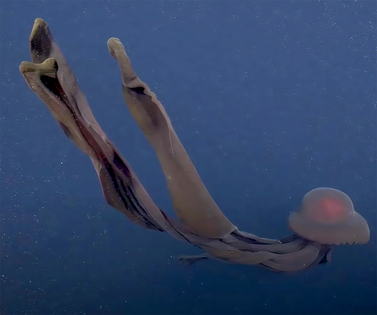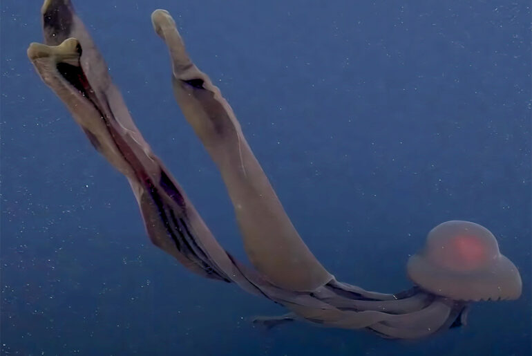 Researchers watched the brotula hover above the bell of its host and swim in and out of the jelly’s voluminous oral arms. The wide-open waters of the midnight zone offer little shelter, so many creatures find refuge in the gelatinous animals that are abundant in this environment,” said the MBARI team.