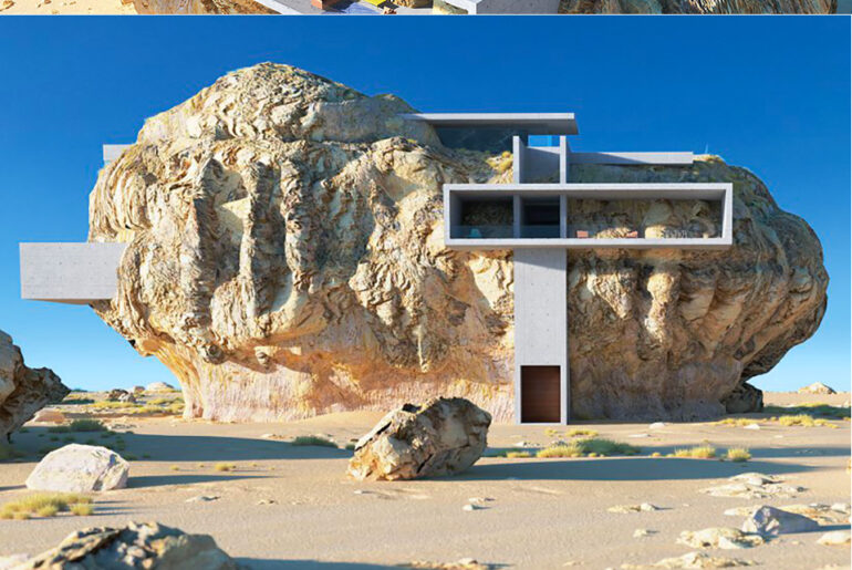 Considering the visual complexity of the rocks at Madain Saleh, it was imperative to use simple planes and cubes in order to achieve a visual balance. I started out creating the rock in 3d software which in itself was a sculpting process. Later when inserting the house into this rock, I tried to keep its visual impact from eye level as minimum as possible and only when observed from a bird eye, the real extent of the intervention is revealed,” said Amey.