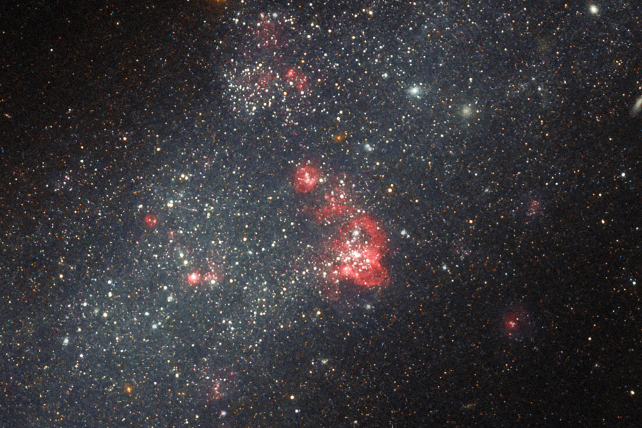 NASA / ESA’s Hubble Space Telescope recently observed UGCA 307, a hazy diminutive dwarf galaxy comprised of diffuse band of stars with red bubbles of gas in regions of recent star formation. Its located approximately 26 million light-years from Earth in the constellation Corvus and is seen as a small patch of stars without a defined structure that resembles a passing cloud.