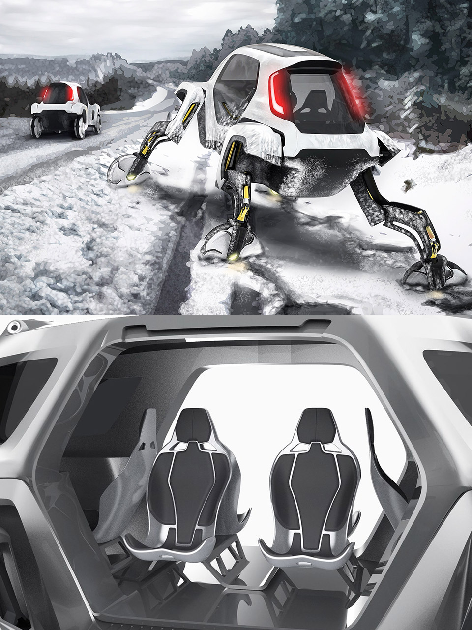 “By combining the power of robotics with Hyundai’s latest EV technology, Elevate has the ability to take people where no car has been before, and redefine our perception of vehicular freedom. Imagine a car stranded in a snow ditch just 10 feet off the highway being able to walk or climb over the treacherous terrain, back to the road potentially saving its injured passengers – this is the future of vehicular mobility,” said David Byron, design manager, Sundberg-Ferar.