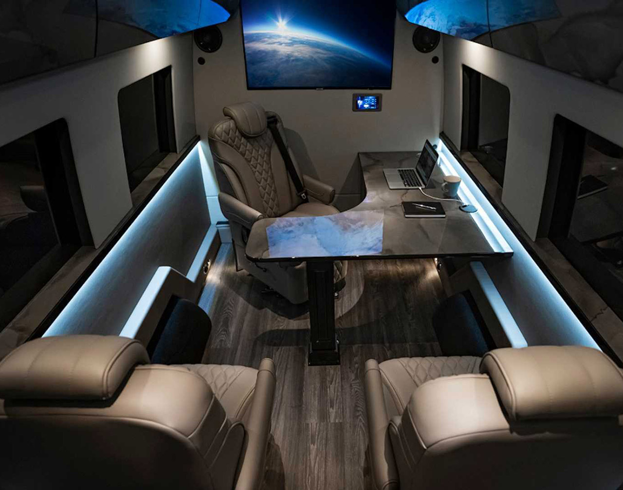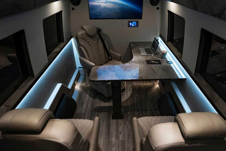 Inside the five-person cabin, this configuration offers an L-shaped desk, four adjustable seats, two 45-inch smart displays, WiFi connectivity, and an intercom system for easy communication between the driver as well as passengers. You can either opt for the basic seats or ones fitted with a massage function, upholstered in the finest leather. There’s no word yet on pricing or availability, but with all of those options, the sky is the limit.