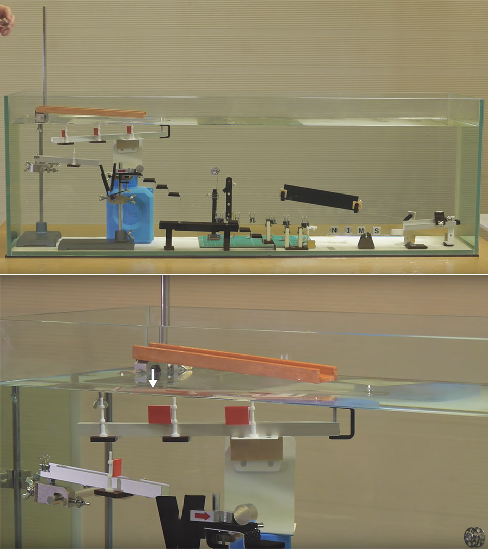At first glance, the Rube Goldberg Machine you’re about to see appears to be just some clever video editing, but it’s actually just a real optical illusion. Put simply, a thick piece of glass sits next to a mixture of two clear, colorless oils, which is adjusted to match the glass’ refractive index. When this glass is submerged in the oil, it seemingly disappears.