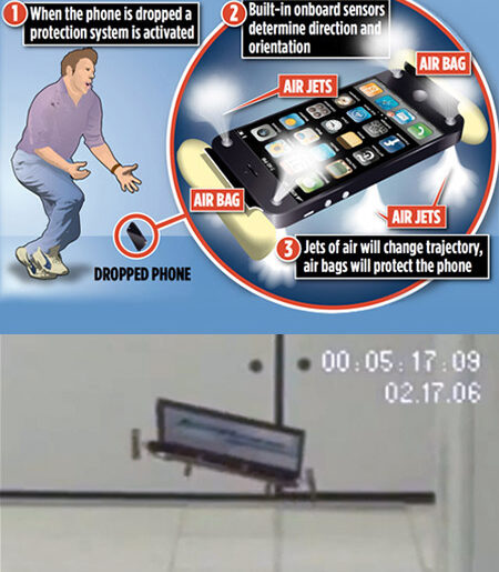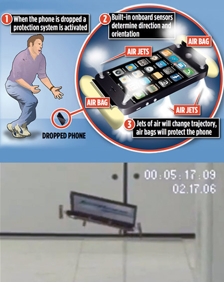 According to the patent filing documents, this system uses the handset’s integrated gyroscope, camera, accelerometers, and other onboard sensors to determine whether it is currently falling. If a fall is detected, the system will deploy airbags to limit possible harm and may alter the trajectory of the fall by firing air jets.