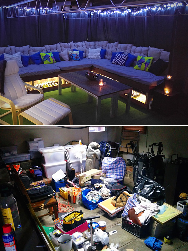 So here’s where we started – a room under our house which we called ‘The Dungeon’. Full of junk left over after moving in. We left it like this for nearly a year while deciding what to do with the room. The steel support beams are about 1.8m off the ground but everywhere else is perfectly fine to walk around in without hitting your head,” said notadeckofcards.