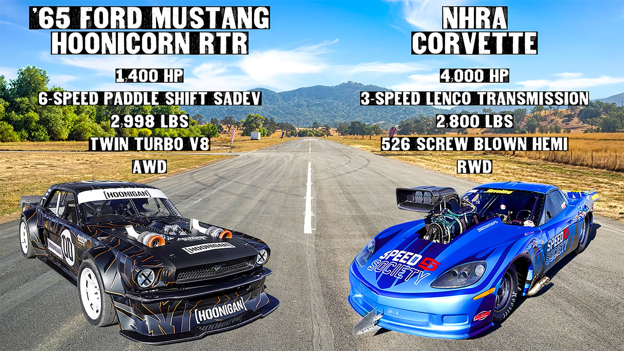 How much do each of these vehicles weigh? Well, the Mustang tips the scales at 2,998-pounds and the Corvette weighs in at 2,800-pounds. The Hoonicorn is powered by a Ford-sourced twin-turbocharged V8 engine, mated to a SADEV transmission that has been upgraded with paddle shifters that sends power to all four corners.