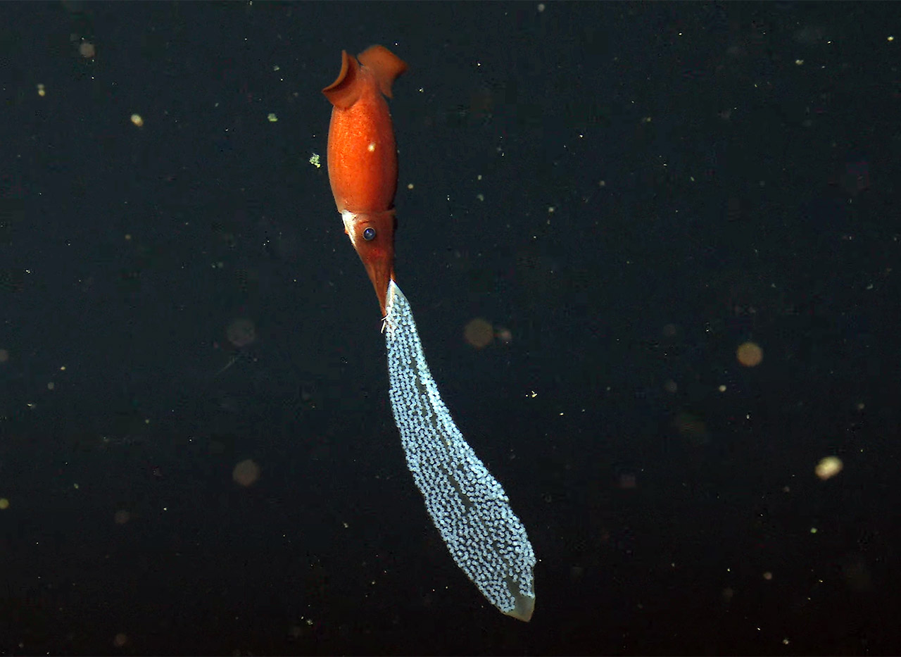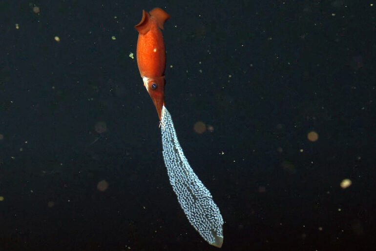 MBARI (Monterey Bay Aquarium Research Institute) researchers used a remotely operated vehicle (ROV) to observe a deep-sea squid mom carrying hundreds of eggs to keep them safe from predators. It was spotted at a depth of 4,560-feet at more than 56-miles offshore from MBARI’s facilities in Moss Landing, California.