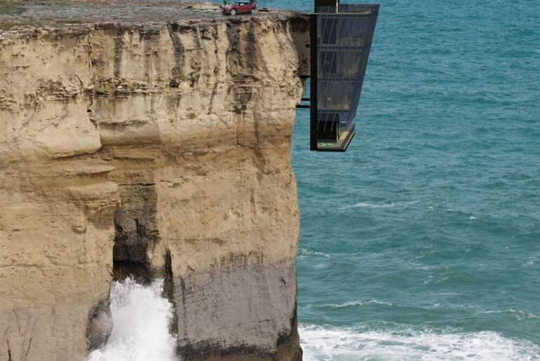Australia-based Modscape Concept specializes in prefabricated architecture, and they designed a strange five story home that hangs off a cliff’s edge a while back, but now, we get a first look inside. It features a modular design and was inspired by the shape of barnacles clinging to a hull of a ship, and that’s why it extends off the side of a cliff, rather than sit directly on it.