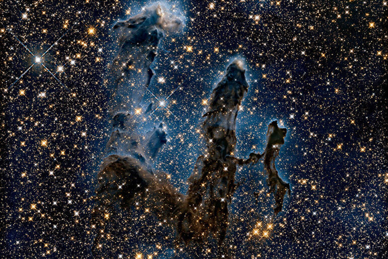 In this ethereal view the entire frame is peppered with bright stars and baby stars are revealed being formed within the pillars themselves. The ghostly outlines of the pillars seem much more delicate, and are silhouetted against an eerie blue haze,” said NASA.