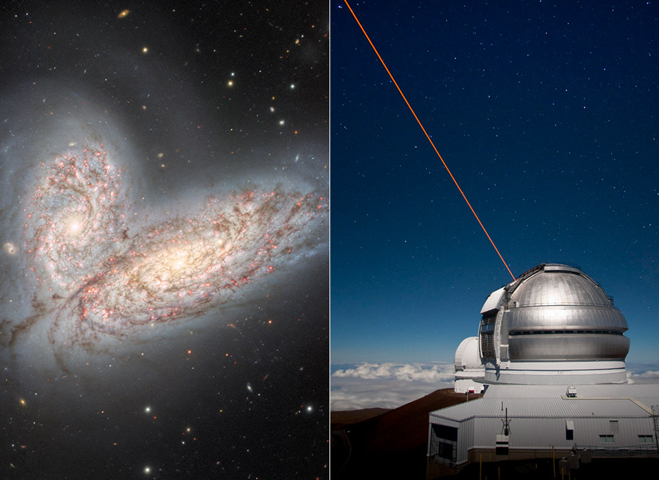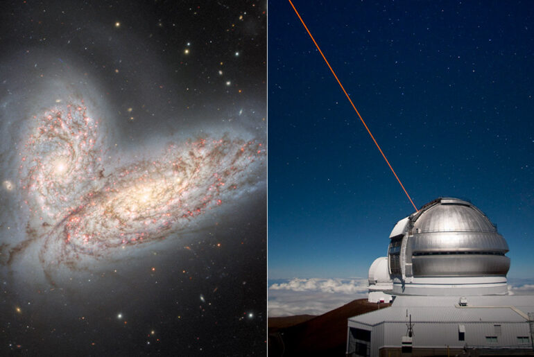 Researchers at NSF’s Gemini North telescope in Hawaii captured two galaxies colliding – NGC 4568 and NGC 4567 — entangled by their mutual gravitational field. These two will eventually combine to form a single elliptical galaxy in approximately 500 million years. You can also see the glowing remains of a supernova that was detected in 2020.