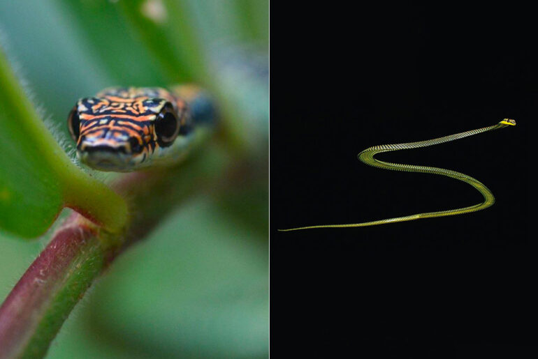 Flying snakes, like the paradise tree snake, can be found residing in the trees of South and Southeast Asia. They slither from tree branches, but to get to the ground or another tree, they’ll catapult themselves into the air and glide down at an angle. To figure out how they glide, researchers placed motion-capture tags on seven snakes and then used high-speed cameras to film them as they glided across a giant four-story-high theater.