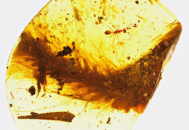 In this small piece of amber, dating back to the mid-Cretaceous Period approximately 99-million-years ago, paleontologist Lida Xing of China University of Geosciences discovered a perfectly preserved dinosaur tail feather from a juvenile coelurosaur.