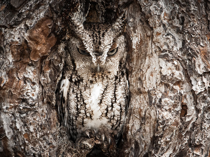 The coloration of the owl’s plumage plays a key role in its ability to sit still and blend into the environment, making it nearly invisible to prey. Owls tend to mimic the colorations and sometimes even the texture patterns of their surroundings, the common barn owl being an exception. Nyctea scandiaca, or the snowy owl, appears nearly bleach-white in color with a few flecks of black, mimicking their snowy surroundings perfectly. Likewise, the mottled wood-owl (Strix ocellata) displays shades of brown, tan and black, making the owl nearly invisible in the surrounding trees, especially from behind. Usually, the only tell-tale sign of a perched owl will be its vocalizations or its vividly colored eyes. Continue reading for more.