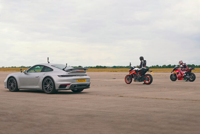 As for its competition, the KTM Red Bull MotoGP bike is powered by a V4 engine producing 270 hp (201 kW) and 89 lb-ft torque, while the KTM road bike (Super DuKe R 1290 Evo) makes 180 hp and 103 lb-ft of torque with its 1,301cc V-Twin engine. Let’s just say that the Porsche 911 Turbo S puts up a massive fight against both motorcycles, and the result may surprise you.