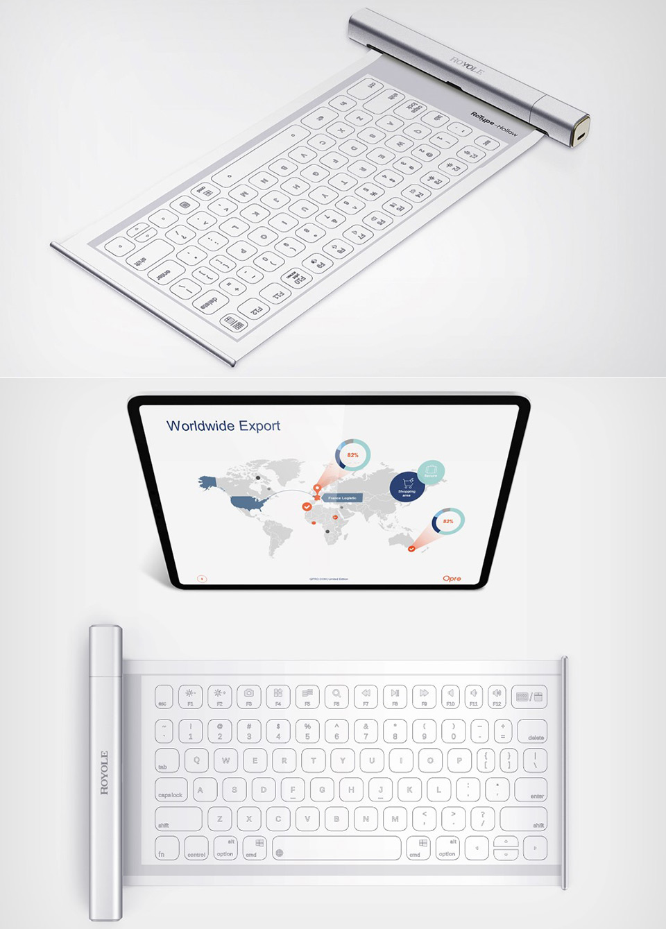 Flexible keyboards are nothing new, but Royole’s latest creation, the RoType, features a transparent design that can be rolled up. At just 0.04mm thick, the surface is covered in a special film with integrated circuits, and it can stretch as well as curl up without deformation. To type, simply touch the surface like you would on any other keyboard.
