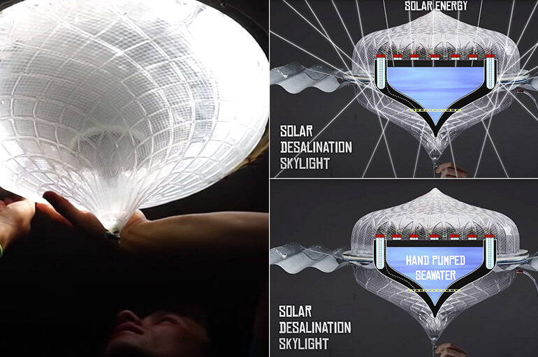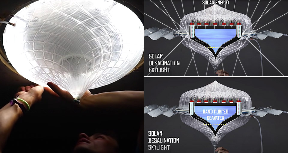 Henry Glogau’s Solar Desalination Skylight doesn’t require any electricity, as it only requires seawater to function. That’s right, not only does it emit a natural diffused light, but also produces drinking water as well as have the ability to utilize leftover salt brine for energy creation. Technically speaking, it’s essentially a combination of salt batteries and solar power. The LED light strip is charged during the day with small solar panel.