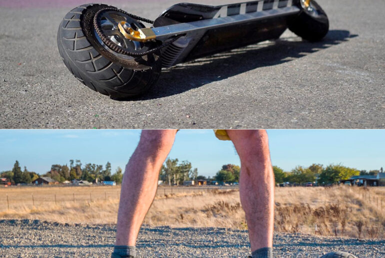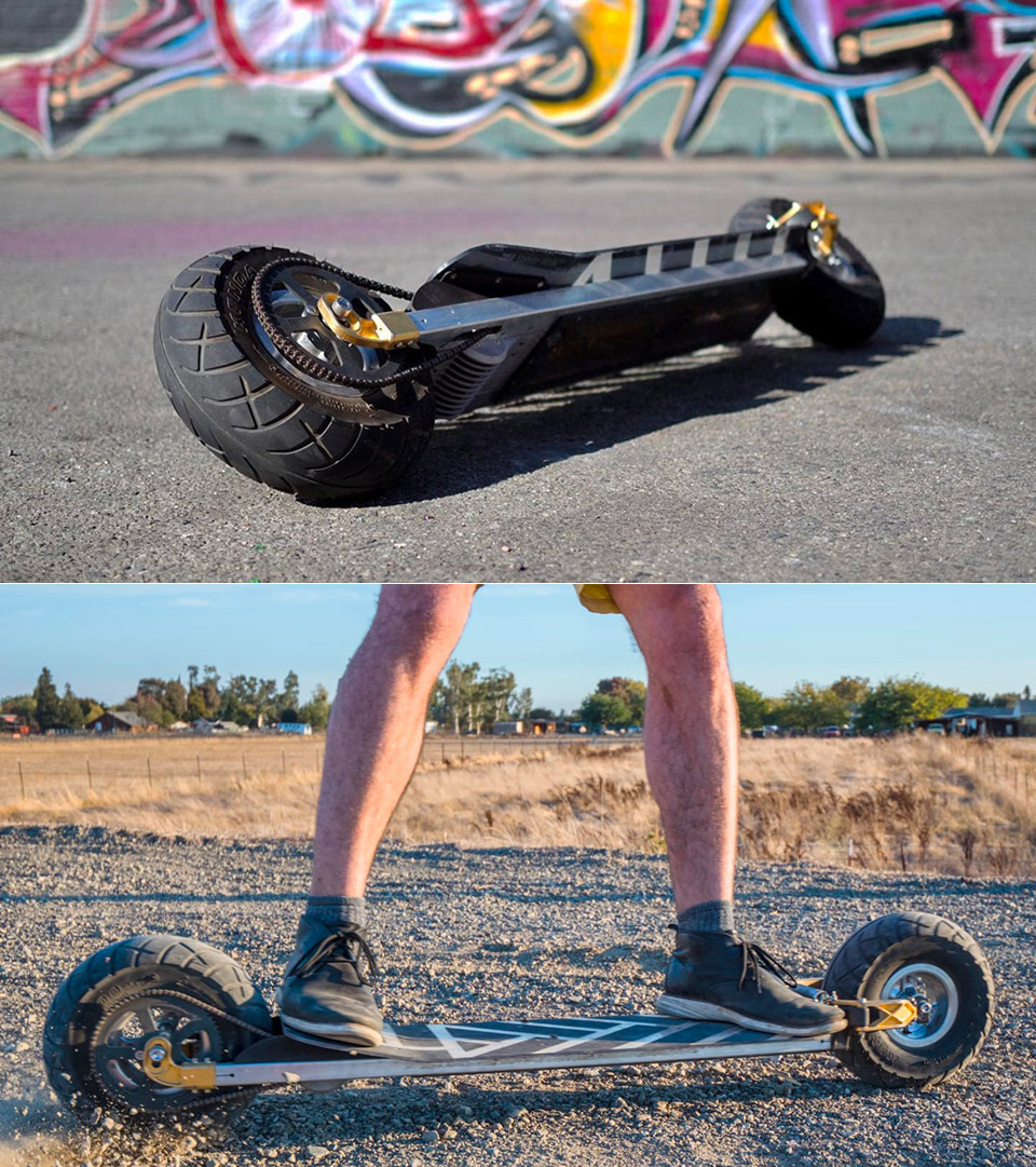 Featuring a chain-drive drivetrain that consists of a 9-tooth hardened steel pinion mounted on the motor shaft, driving a 70-tooth steel sprocket on the rear wheel using a steel chain with a tensile strength of 1,300 lb, good for a 30-mph top speed. Riders can control the speed and activate the brakes using a handheld radio remote control unit. All of this is powered by a 4,000-watt motor comprised of 52 lithium-ion batteries located inside the deck. When fully charged, expect a 24-mile range. Kickstarter page here.