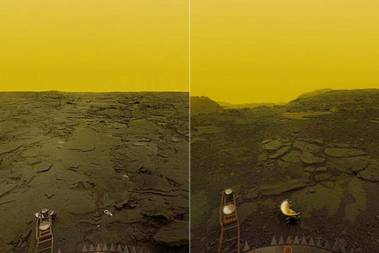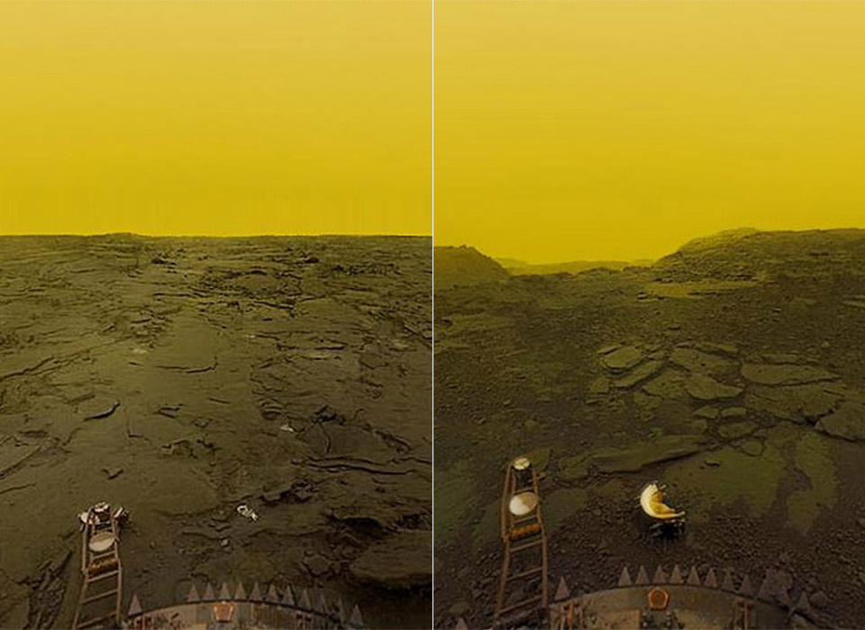 After Venera 13’s launch in 1981 and a four-month cruise to Venus, the descent vehicle separated from the cruise stage and plunged into the Venusian atmosphere on March 1, 1982. After entering the atmosphere, a parachute was deployed at an altitude of 31 mi and simple air-braking was used to slow its journey to the surface. The lander was equipped with cameras to take photograph the ground, while spring-loaded arms measured the compressibility of the soil. Once it landed, an imaging panorama was started and a mechanical drilling arm obtained a sample, which was deposited in a hermetically sealed chamber.
