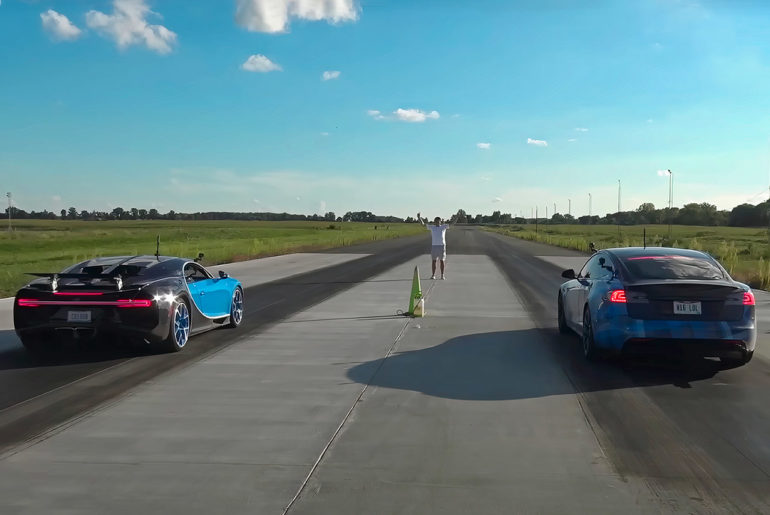 With a quad-turbocharged 8.0L W16 engine that makes 1,500 hp and 1,180 lb-ft of torque, the Bugatti Chiron is seemingly unbeatable in a drag race by any sub-$200K vehicles straight from the factory, but the Tesla Model S Plaid would beg to differ. The latter has a triple electric motor setup making 1,020 hp and it’s even 500-pounds heavier than the Chiron.