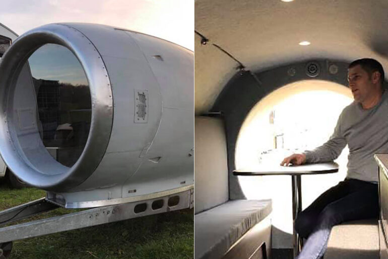 Former aerospace mechanic for the Royal Air Force and now a stay-at-home dad Steve Jones managed to transform hollowed-out jet engine shell from a Vickers VC10 into a functional camper trailer for his family in Lancashire, England. In all, he spent around 1,000-hours between January and mid-March to complete the build.