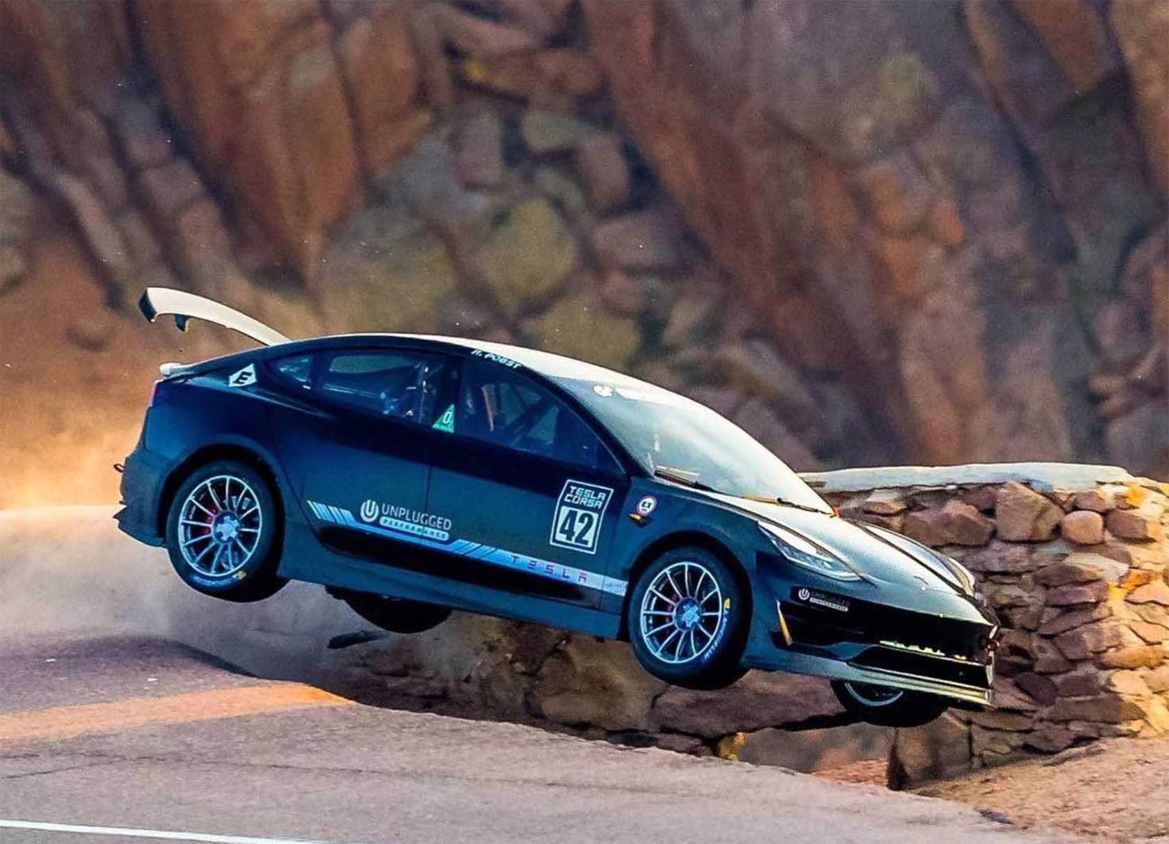 Unplugged Performance’s heavily modified Tesla Model 3 headed to the 2020 Pikes Peak International Hill Climb with professional race car driver Randy Pobst. It may be all-electric, but this EV posted a respectable qualifying time that placed it third overall when you include the open-wheel racers that qualified the same day, with a 4:12.429 time.