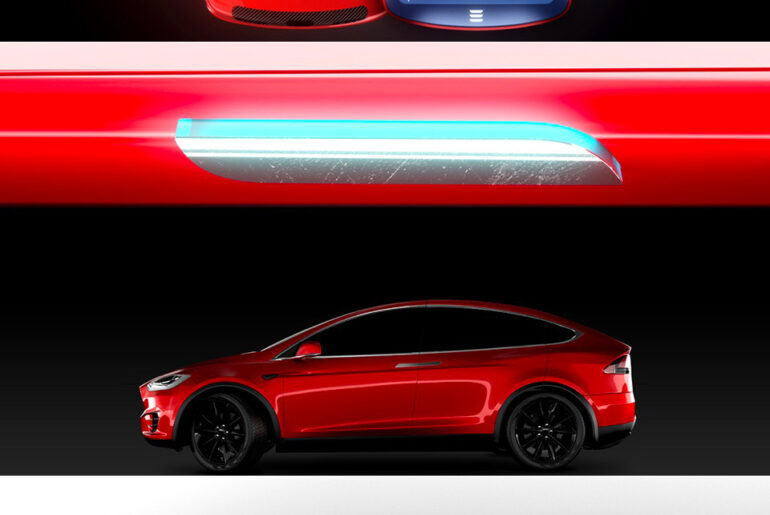 Sure, there’s Tesla apps for both iOS and Android, but they do have their limitations. What if Elon Musk decided to release a smartphone designed to accompany his company’s vehicles? Introducing the Model P. Its sleek exterior is finished in a glossy red, and instead of a hole-punch or teardrop display, there’s a cutout that resembles a Tesla Model S / X front grille, while carbon fiber adorns the charging port area.