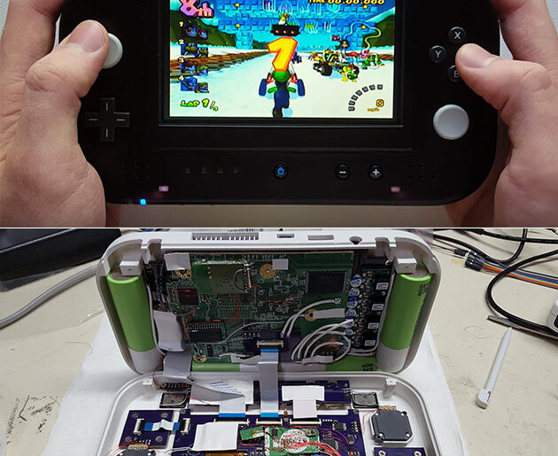 At first glance, this looks like a Nintendo Switch, but it’s actually Jackson Snowden’s Wii SP. This portable Nintendo Wii features infrared LEDs for a sensor bar, 3DS-sourced joysticks, DS Lite buttons, and a full size USB port. That’s not all, there’s also three controllers built in: an original Classic controller, an original GameCube controller and a PIC microcontroller to convert inputs from the 3DS joysticks.