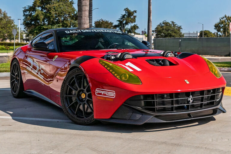 Gas Monkey Garage’s Aaron Kaufman is known for his crazy supercar builds, and his latest for Daily Driven Exotics is no exception. This twin-turbocharged Ferrari F12 is unlike any other as to even fit the giant turbines, he had to completely disassemble the front end, including the inner fenders as well as cut holes in the hood. That’s not all, the throttle bodies also needed to be shifted to the front of the motor and the charge pipes relocated right down into the center of the intercooler.