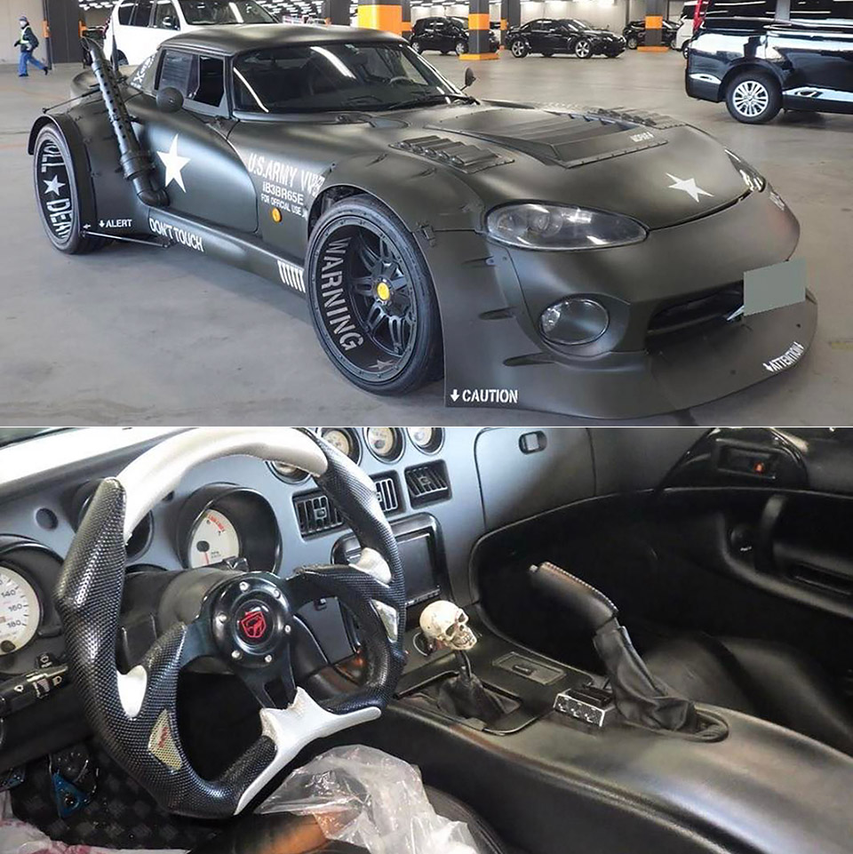 If the US Army modded a Dodge Viper, it probably wouldn’t look like this one listed for sale at J’S Auto in Hong Kong. Why is it so wide in the rear? It has been given a dually setup, which means that there are two rear wheels on either side, typically found on pickup trucks for heavy-duty performance purposes.