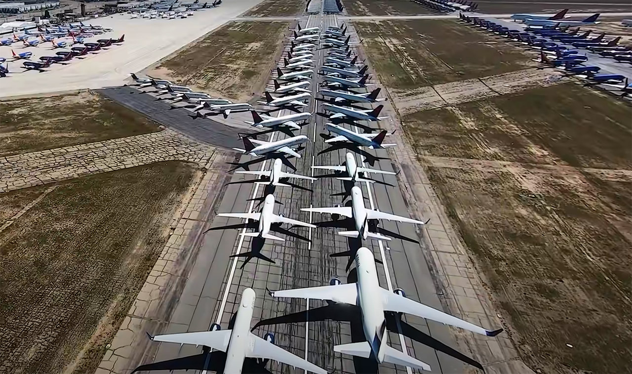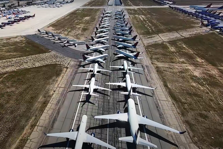 Pilot Bryan Keith took his Grumman Tiger for a low altitude flyby over the closed runway of Southern California Logistics Airport (SCLA) in Victorville, California. This is where you’ll find over 400 planes in long-term parking from various airlines, including Delta, Southwest, and more, due to the decrease in passenger flights during the COVID-19 pandemic.