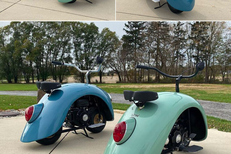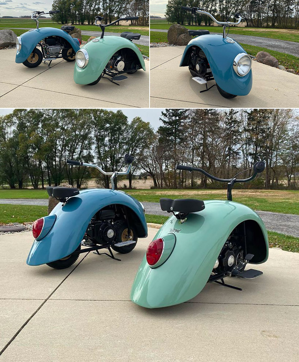 Auto enthusiast Brent Walter transformed an original 1971–1973 Volkswagen Type 1 Beetle into two functional motorbikes, called “Volkspod”. They’re powered a 79cc (birch green) and 212cc (pastel blue) Volkswagen engines and the frame has been modified to include a functional headlight and taillight systems. No performance numbers were mentioned, but on a related note, the original 25 hp Beetle was designed for a top speed around 100 km/h (62 mph).